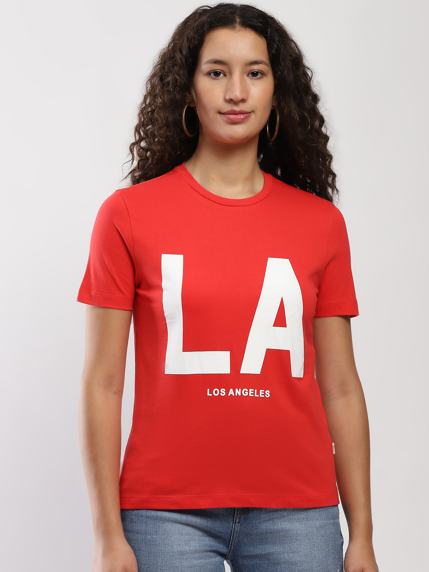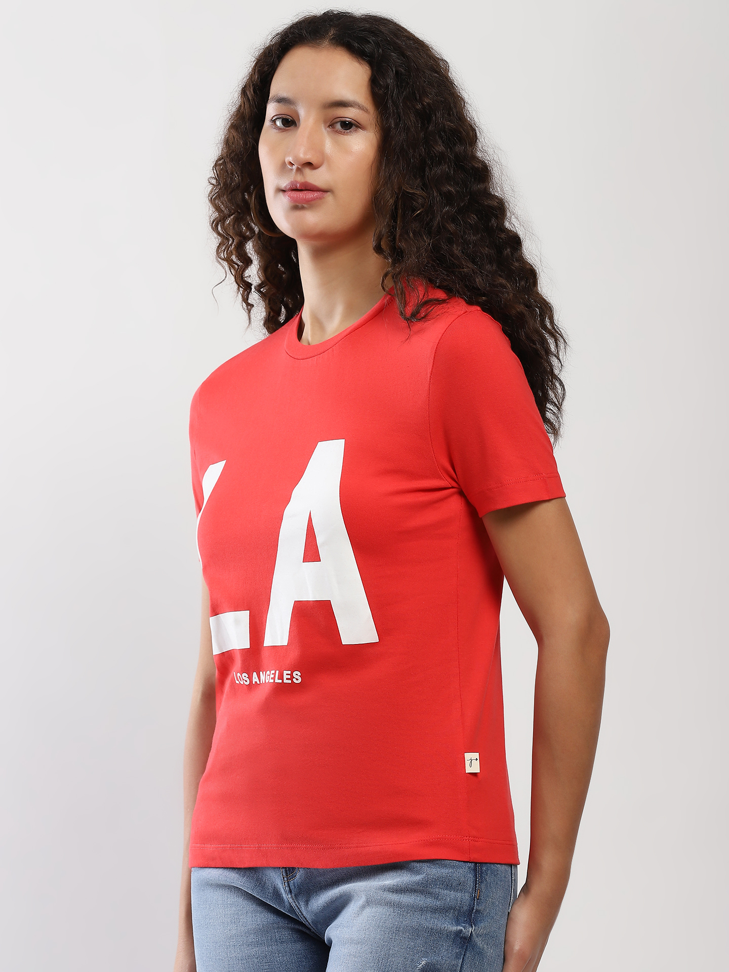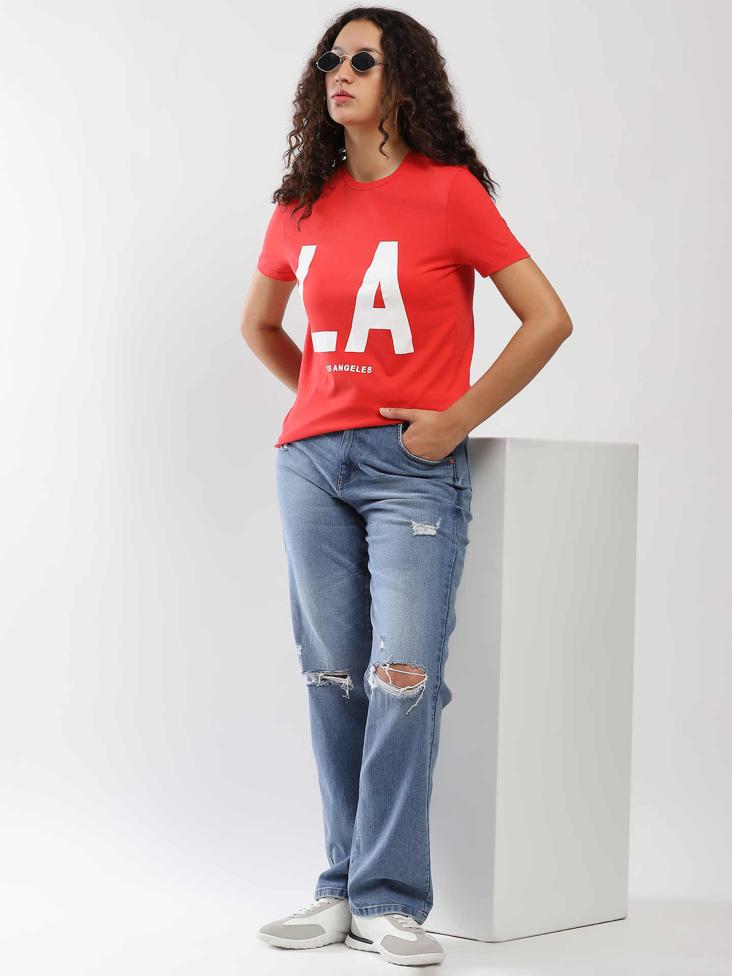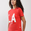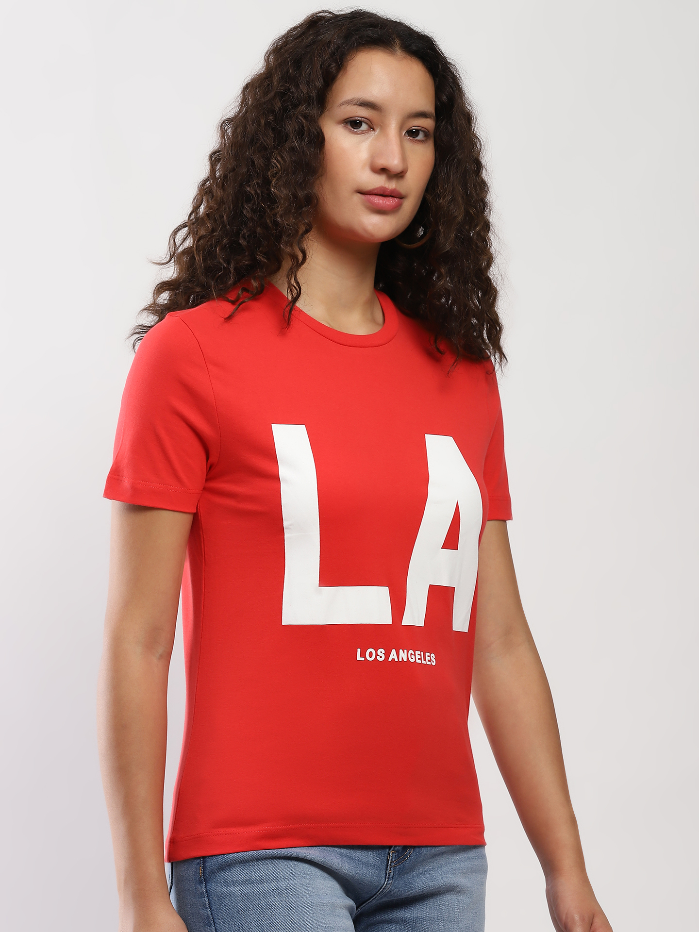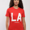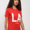 Cotton T-shirt. Round neck and short sleeve. Text detail L A print .